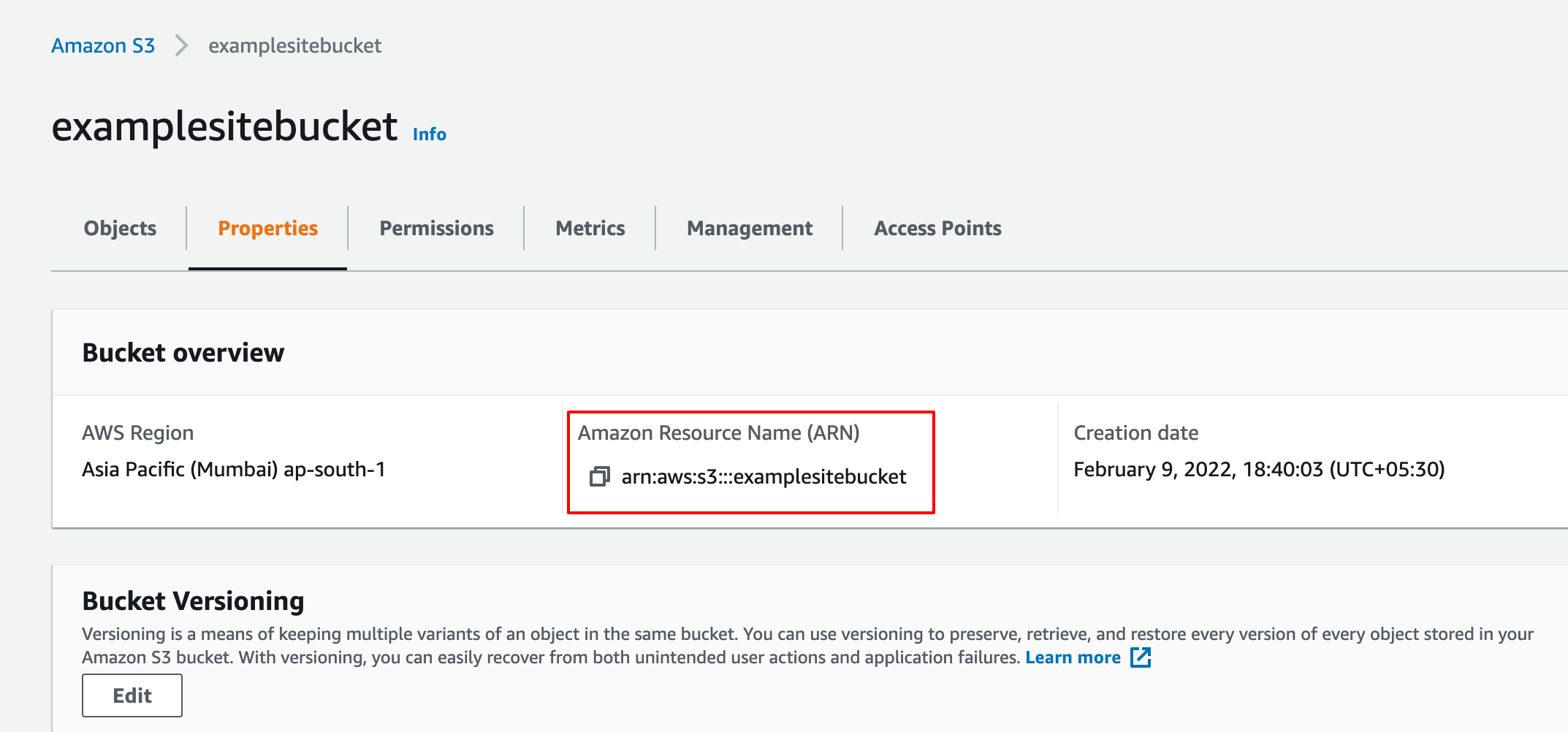 - for my bucket ARN: arn:aws:s3:::examplesitebucket