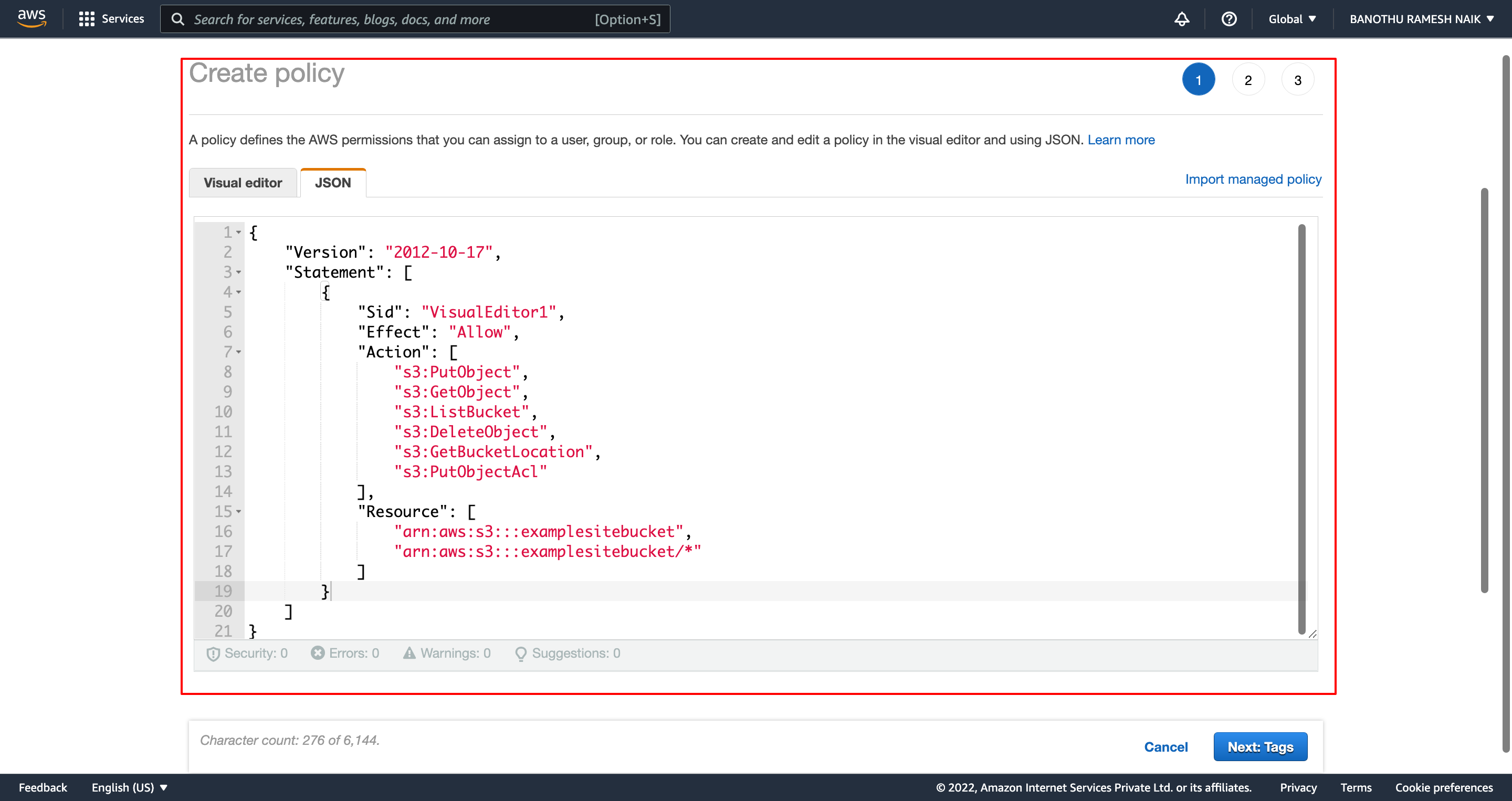 { "Version": "2012-10-17", "Statement": [ { "Sid": "VisualEditor1", "Effect": "Allow", "Action": [ "s3:PutObject", "s3:GetObject", "s3:ListBucket", "s3:DeleteObject", "s3:GetBucketLocation", "s3:PutObjectAcl" ], "Resource": [ "arn:aws:s3:::examplesitebucket", "arn:aws:s3:::examplesitebucket/*" ] } ] }