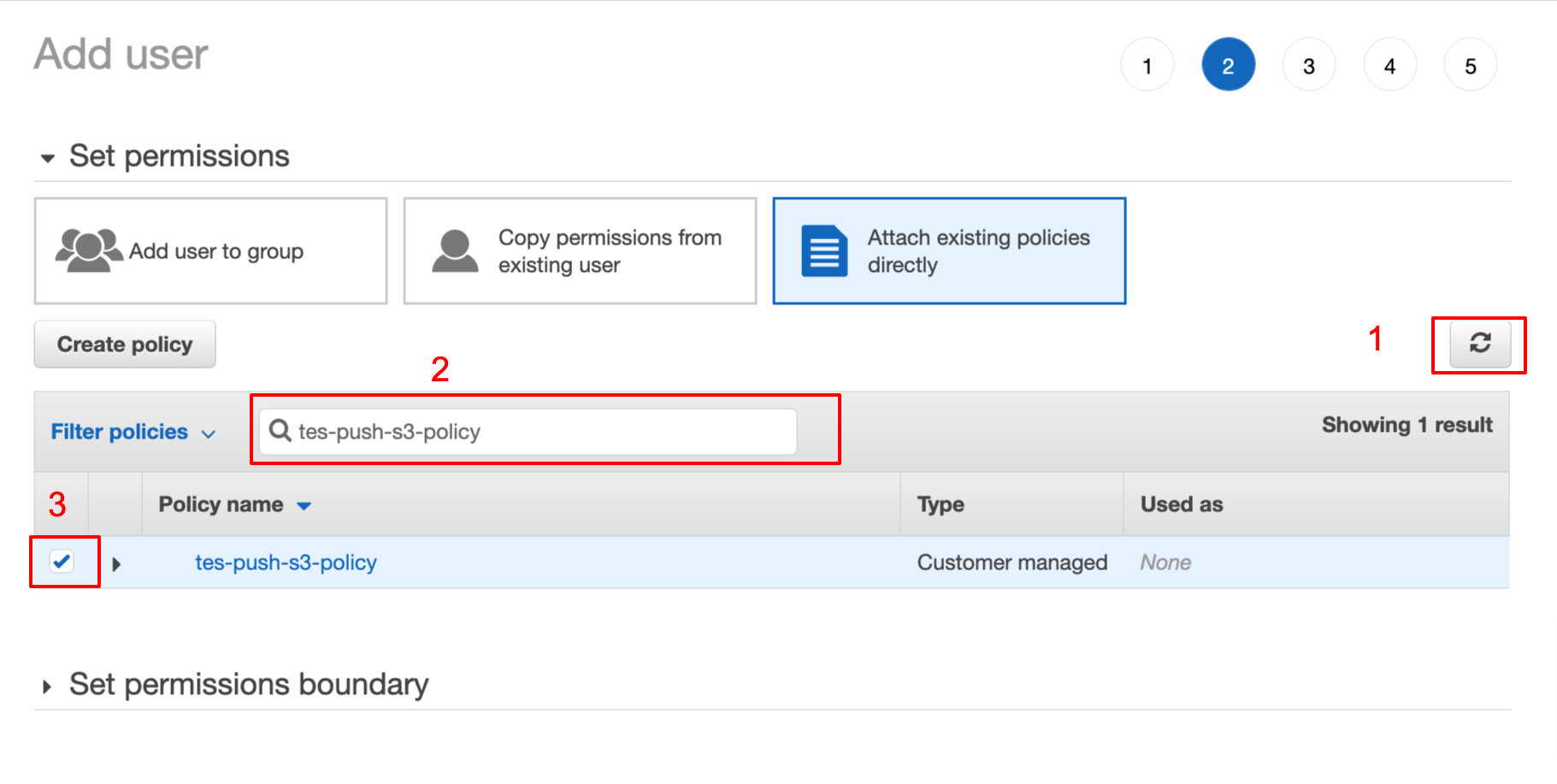 - In the permissions step, we need to attach permissions policy which we created in above step.